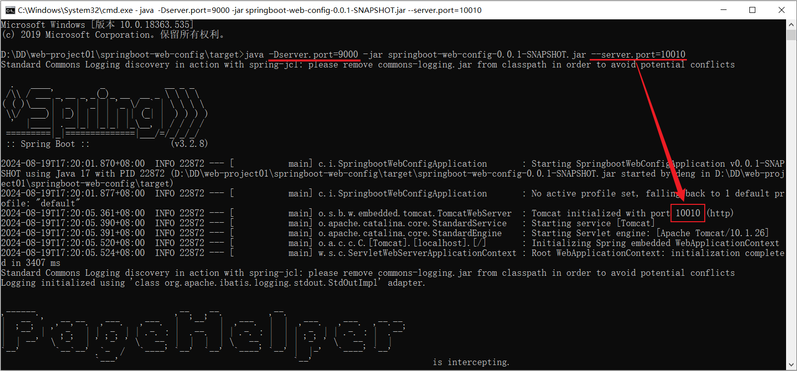 (命令行的优先级更高,所以最终端口号为10010)