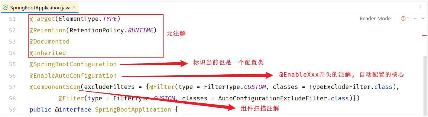 @SpringBootApplication一个组合注解,其源码大致如下(简化):