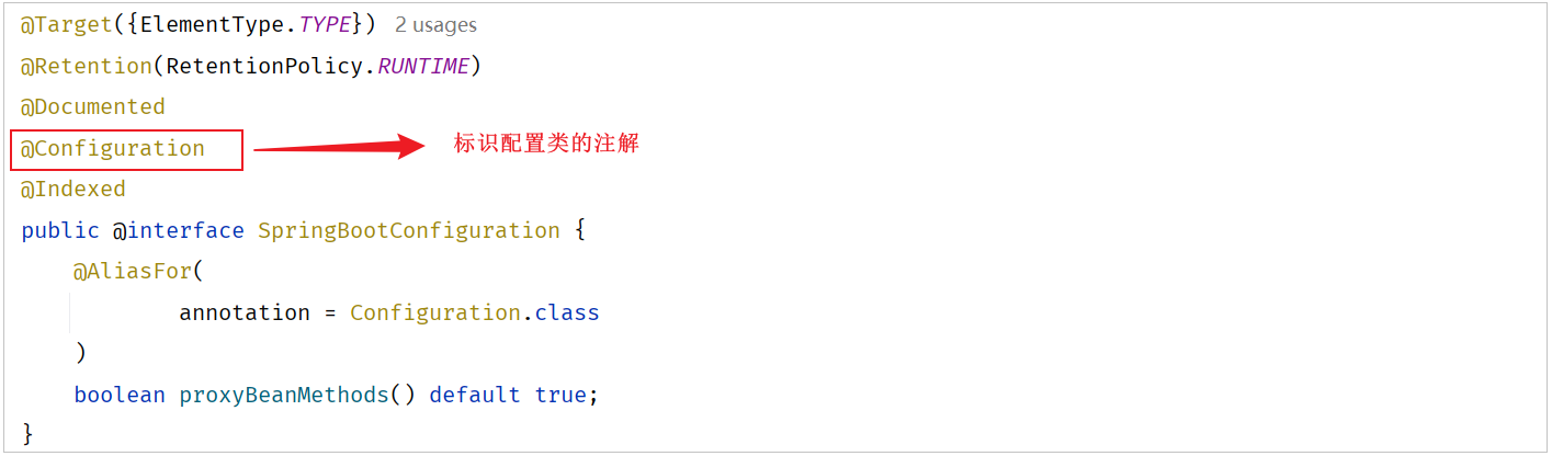 @SpringBootConfiguration注解上使用了@Configuration,表明SpringBoot启动类就是一个配置类。