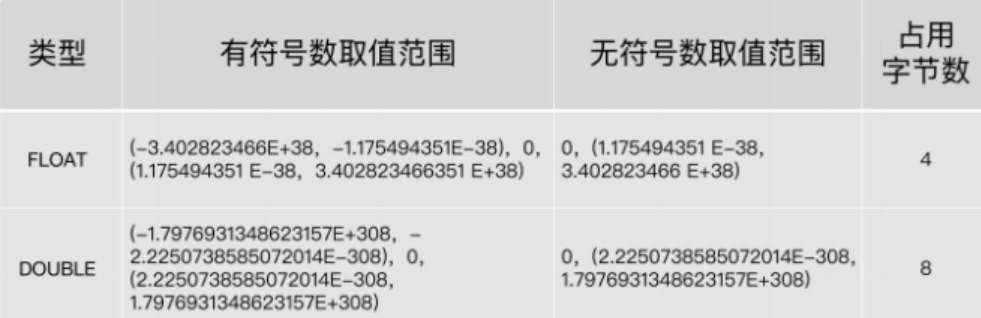 MySQL 存储浮点数的格式为: 符号(S) 、 尾数(M) 和 阶码(E) 。因此,无论有没有符号,MySQL 的浮点数都会存储表示符号的部分。因此, 所谓的无符号数取值范围,其实就是有符号数取值范围大于等于零的部分