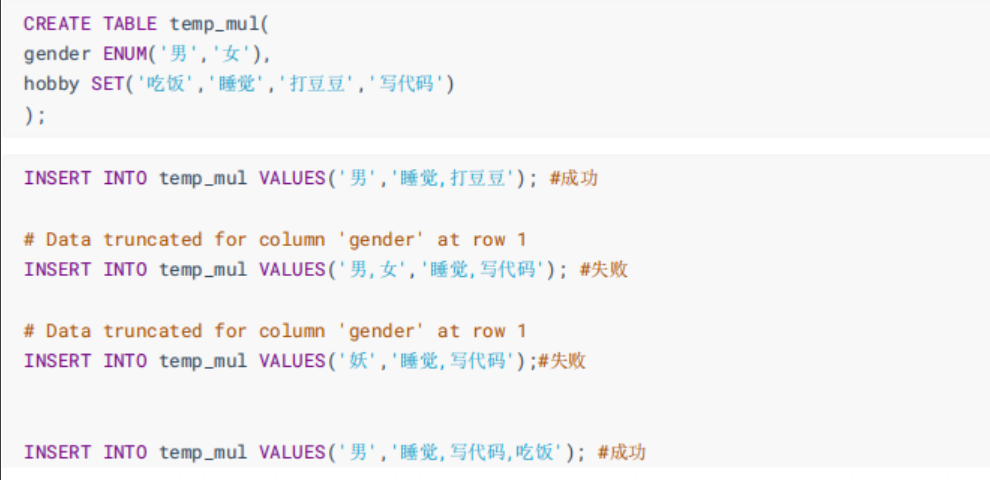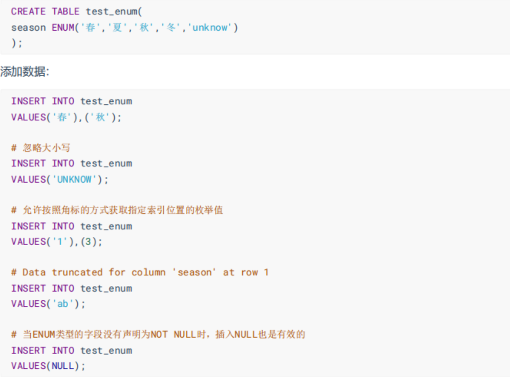 (2)可以使用不带有冒号的 字符串或者数字,格式为' HHMMSS '或者 HHMMSS 。如果插入一个不合法的字符串或者数字,MySQL在存储数据时,会将其自动转化为00:00:00进行存储。比如1210,MySQL会将最右边的两位解析成秒,表示00:12:10,而不是12:10:00。