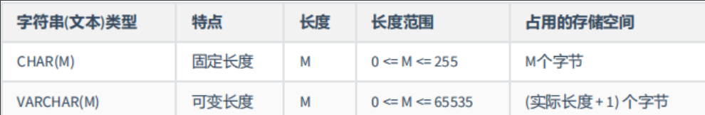 2,VARCHAR(M) VARCHAR(M) 定义时, 必须指定 长度M,否则报错。 MySQL4.0版本以下,varchar(20):指的是20字节,如果存放UTF8汉字时,只能存6个(每个汉字3字节) ;MySQL5.0版本以上,varchar(20):指的是20字符。 检索VARCHAR类型的字段数据时,会保留数据尾部的空格。VARCHAR类型的字段所占用的存储空间为字符串实际长度加1个字节。