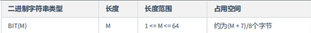BIT类型,如果没有指定(M),默认是1位,表示只能存储1位的二进制,这里(M)表示的是二进制的位数,最小值为1,最大值为64