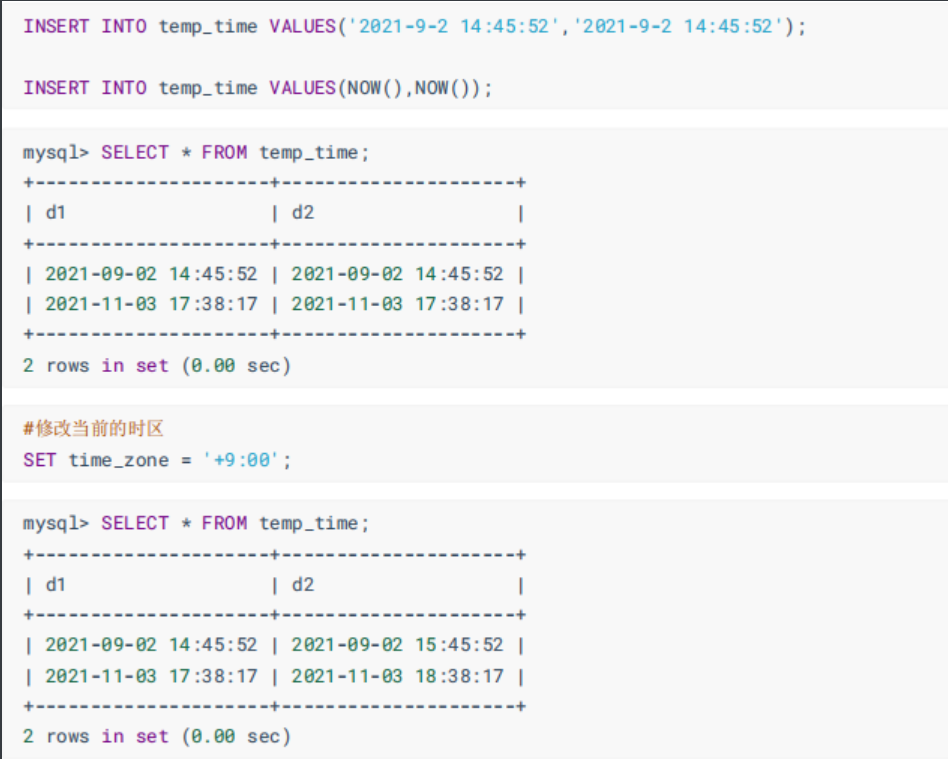 区。因此,使用TIMESTAMP存储的同一个时间值,在不同的时区查询时会显示不同的时间