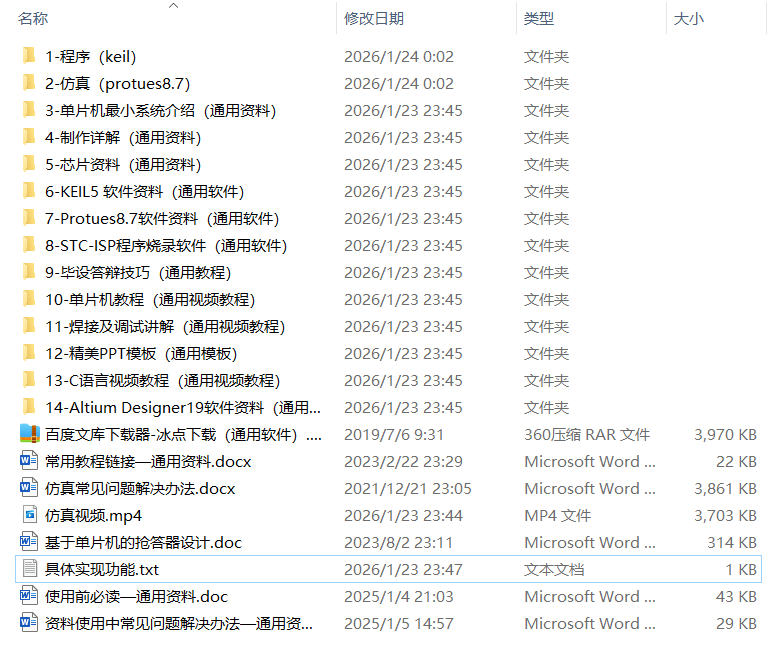 全部资料包括程序(keil5)、protues仿真(protues8.7)、开发资料、资料使用介绍、仿真视频、程序讲解视频、仿真讲解视频、最小系统介绍视频等。