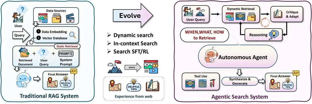 优化传统RAG依赖于向量数据库上的静态检索,而Agentic搜索引入了自主决策机制,以决定何时、如何以及检索什么内容,从而实现动态搜索、上下文检索、批判与适应环以及工具使用。