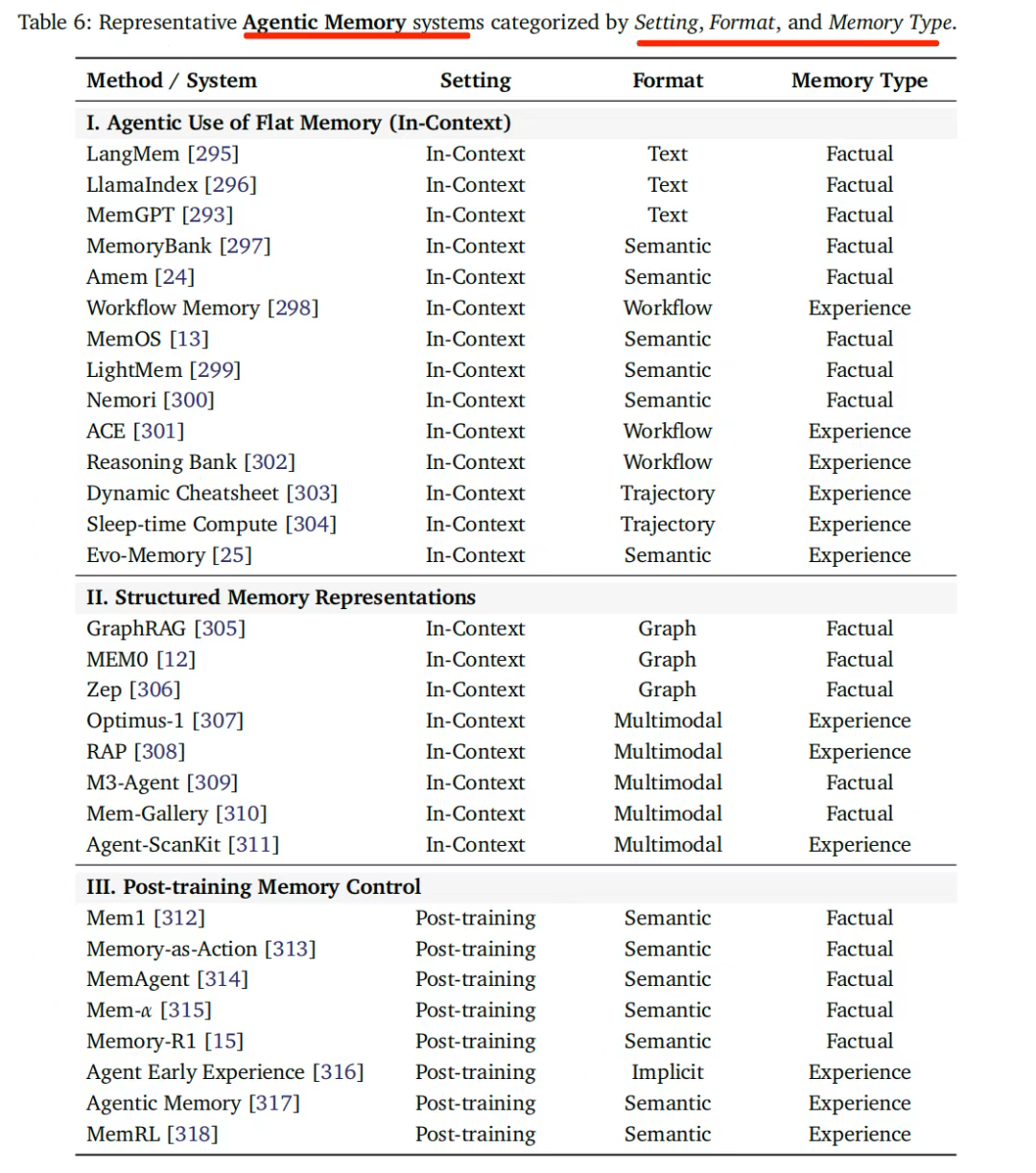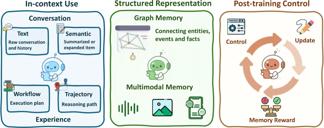 从实现上,分成多种:上下文记忆捕获先前交互中的文本和语义信息;结构化记忆将这些信息整合为图表示和多模态表示;后训练控制使智能体能够通过学成的基于奖励的机制,实现记忆的演化、更新和检索。