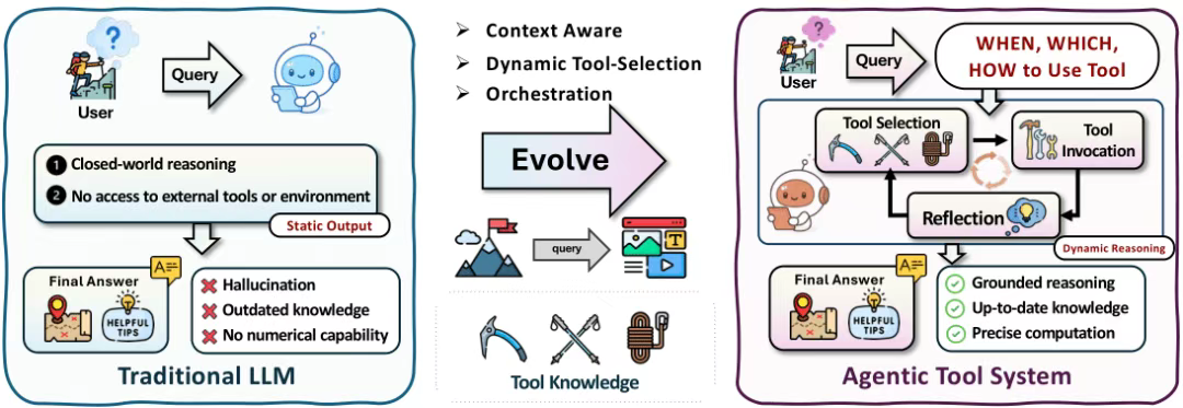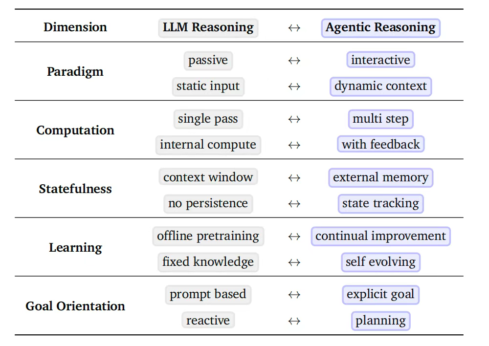 与传统LLM推理相比,关键差异体现在范式(被动→交互)、输入(静态→动态)、计算(单步→多步)、记忆(上下文窗口→外部记忆)、学习(离线预训练→持续改进)等维度