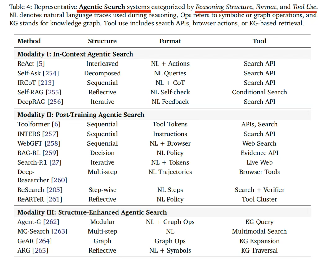 具体实现范式可以分为上下文内In-Context Search、后训练Post-Training Searc和结构增强型Structure-Enhanced Search几种实现,现有系统的具体情况如下表所示,可以看其中的方法、结构、数据格式以及使用的工具。