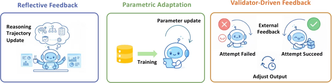 演化的核心包含两个基本机制:反馈与记忆。反馈为自我修正与优化提供评估信号,使智能体能够根据结果或环境响应来调整其推理策略。记忆则作为持久的基底,用于存储、组织和综合过往交互,从而实现跨任务的知识积累与复用。