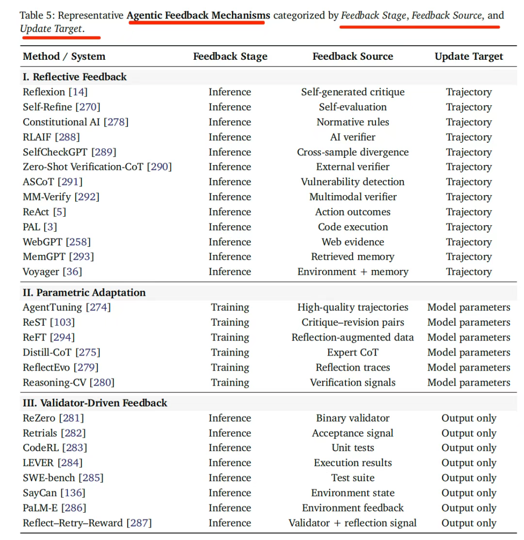 - 其中,反思包括三种。反思性反馈,模型通过自我批判或验证来修正其推理;参数化适应,将反馈整合为更新后的模型参数;以及验证器驱动的反馈,通过二元结果信号引导重采样,无需内部反思。