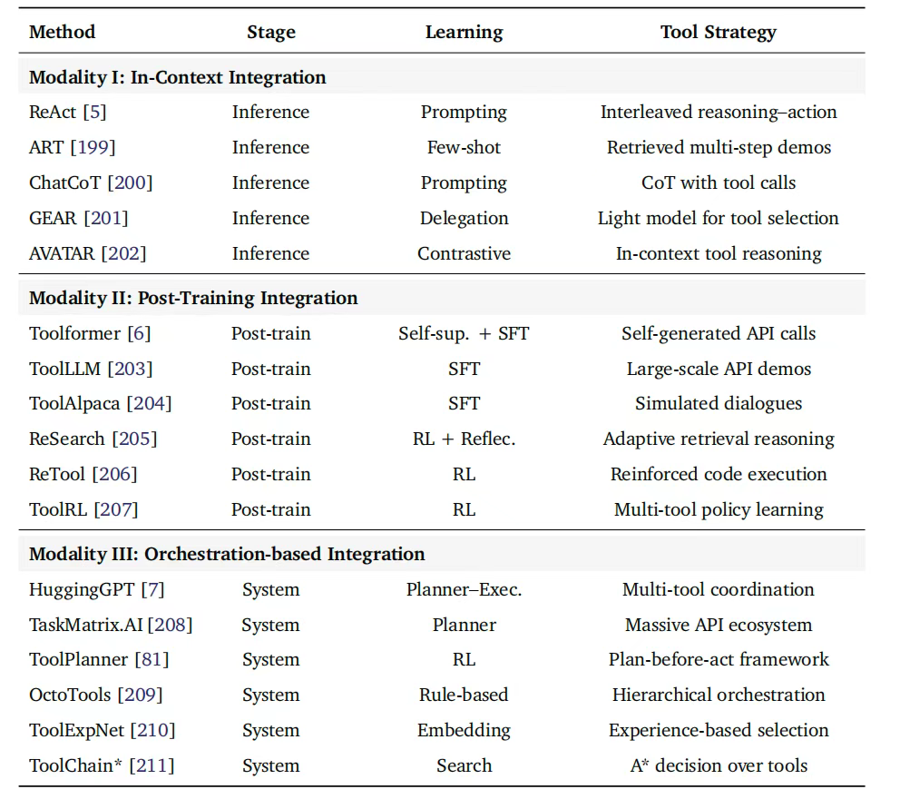 工具使用最优化,可分为三种风格:上下文内工具集成、后训练工具集成,以及编排式工具集成。