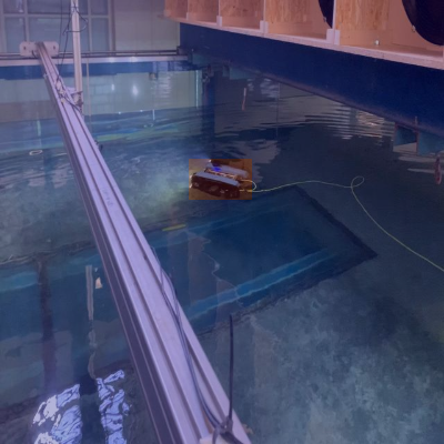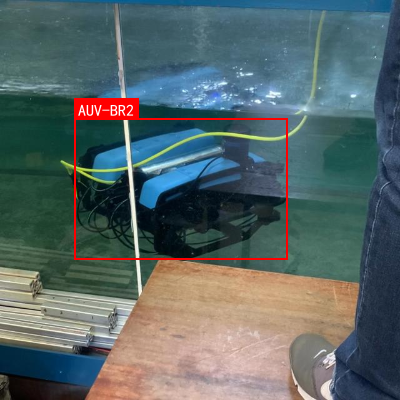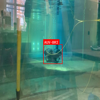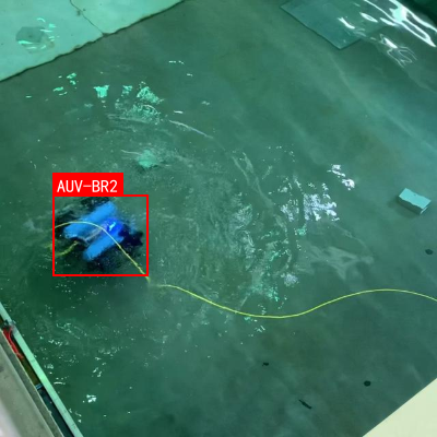图:AUV-BR2在水池环境中的测试场景,红色框标注的AUV-BR2主体呈现深色,表面有蓝色发光部件,旁边连接黄色线缆,整体场景模拟了水下作业环境。该图片为后续目标检测算法提供了重要的视觉样本,帮助训练模型实现对水下航行器的精准定位与识别。