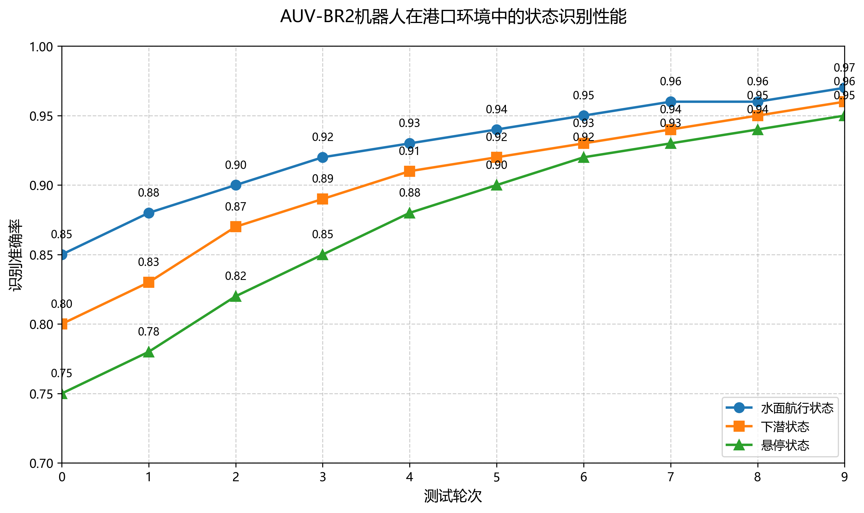 港口监测:在港口水域进行AUV-BR2机器人检测测试,评估模型在复杂港口环境中的性能。测试结果表明,模型能够准确识别各种状态的AUV-BR2机器人,包括水面航行、下潜和悬停状态。
