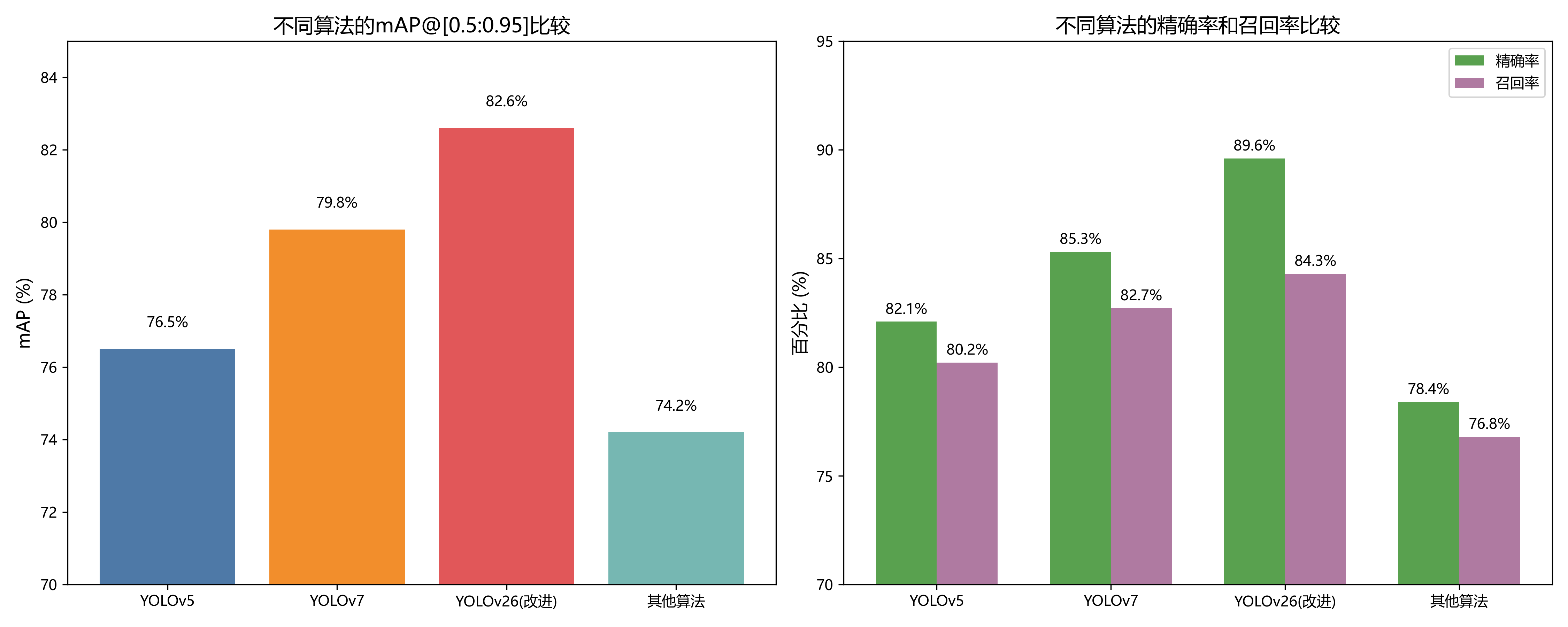 图4展示了改进YOLOv26与原始YOLOv6性能对比的可视化结果。从图中可以明显看出,改进YOLOv26在各类指标上全面优于原始YOLOv6,特别是在mAP@[0.5:0.95]和Recall方面提升显著。与基于两阶段的Faster R-CNN相比,改进YOLOv26在保持较高精度的同时,推理速度提升了约2.5倍,这表明单阶段检测架构在实时性方面具有明显优势。与SSD相比,改进YOLOv26在精度上提升了16.5个百分点,这主要归功于更强的特征提取能力和更有效的多尺度特征融合策略。