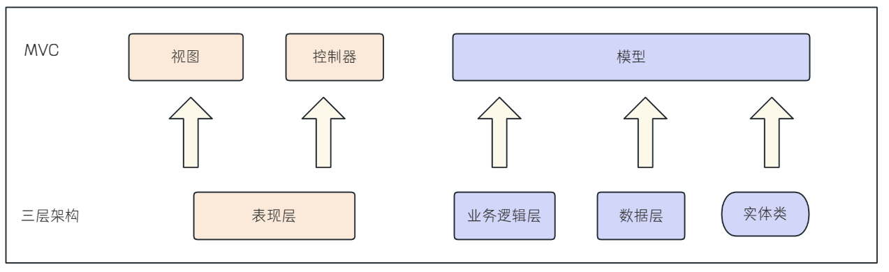 MVC 中,视图和控制器合起来对应三层架构中的表现层。模型对应三层架构中的业务逻辑层、数据层,以及实体类。