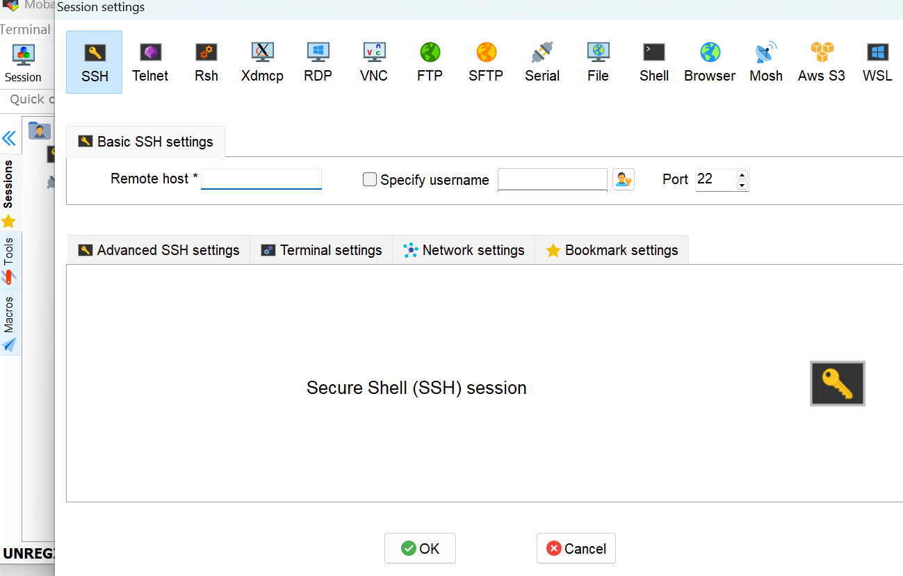 在图中可以看到我们得到了两个ip其中第一个是NAT模式 下的ip,第二个是桥接模式 下的ip。NAT模式就是指虚拟机在依托于本机的ip下再自己新建一个属于自己的ip ,桥接模式就是虚拟机和本机获取到一个同网段下的ip ,当使用NAT模式进行上网时对外显示的ip是主机的ip ,使用桥接模式进行上网时对外显示的是虚拟机自己的ip 。当虚拟机有两个ip时就需要在本机window系统下通过ping命令来看能ping通哪个ip,使用能ping通的ip来继续MobaXterm的远程登录Ubuntu。有了ip之后打开MobaXterm软件点击Session图标再点击弹窗中的SSH进入如下图所示界面: