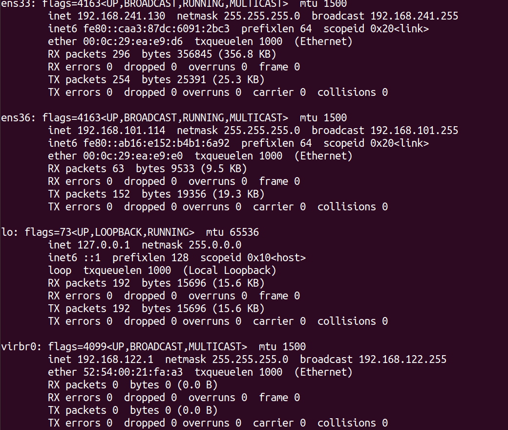 在MobaXterm软件 中可以实现远程登录ubuntu进行使用,首先我们要在虚拟机中的ubuntu下打开终端输入ifconfig命令得到ubuntu的ip如下图所示: