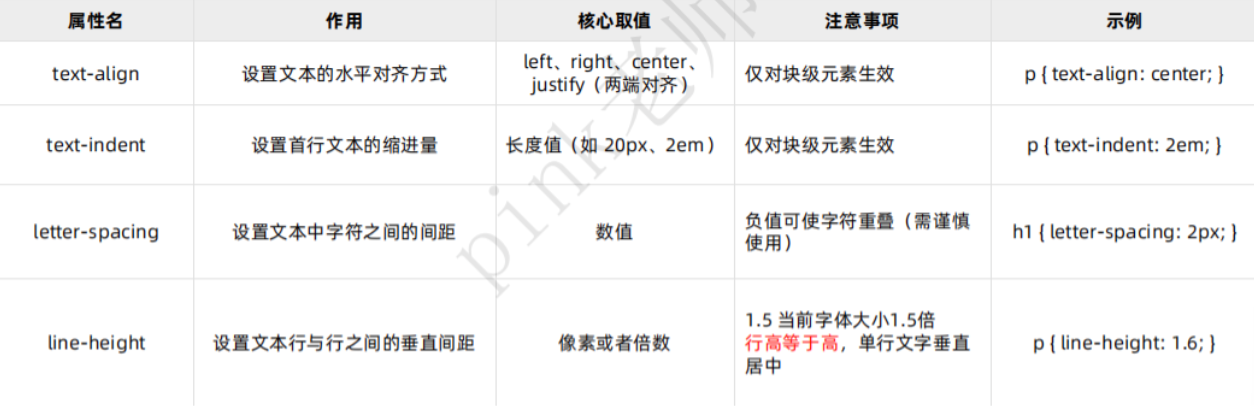 定义:作用于文本的对齐、缩进、间距等布局功能的属性