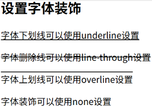 定义:设置/取消字体上的文本装饰,一般用在链接下划线(用来取消下划线) 和添加删除线(特殊)