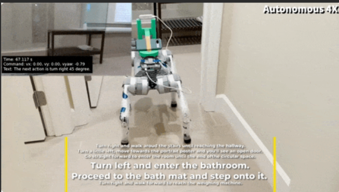 - 指令: "看到自动门了吗?往中间走,别撞玻璃"。VLA 接管,理解环境语义。