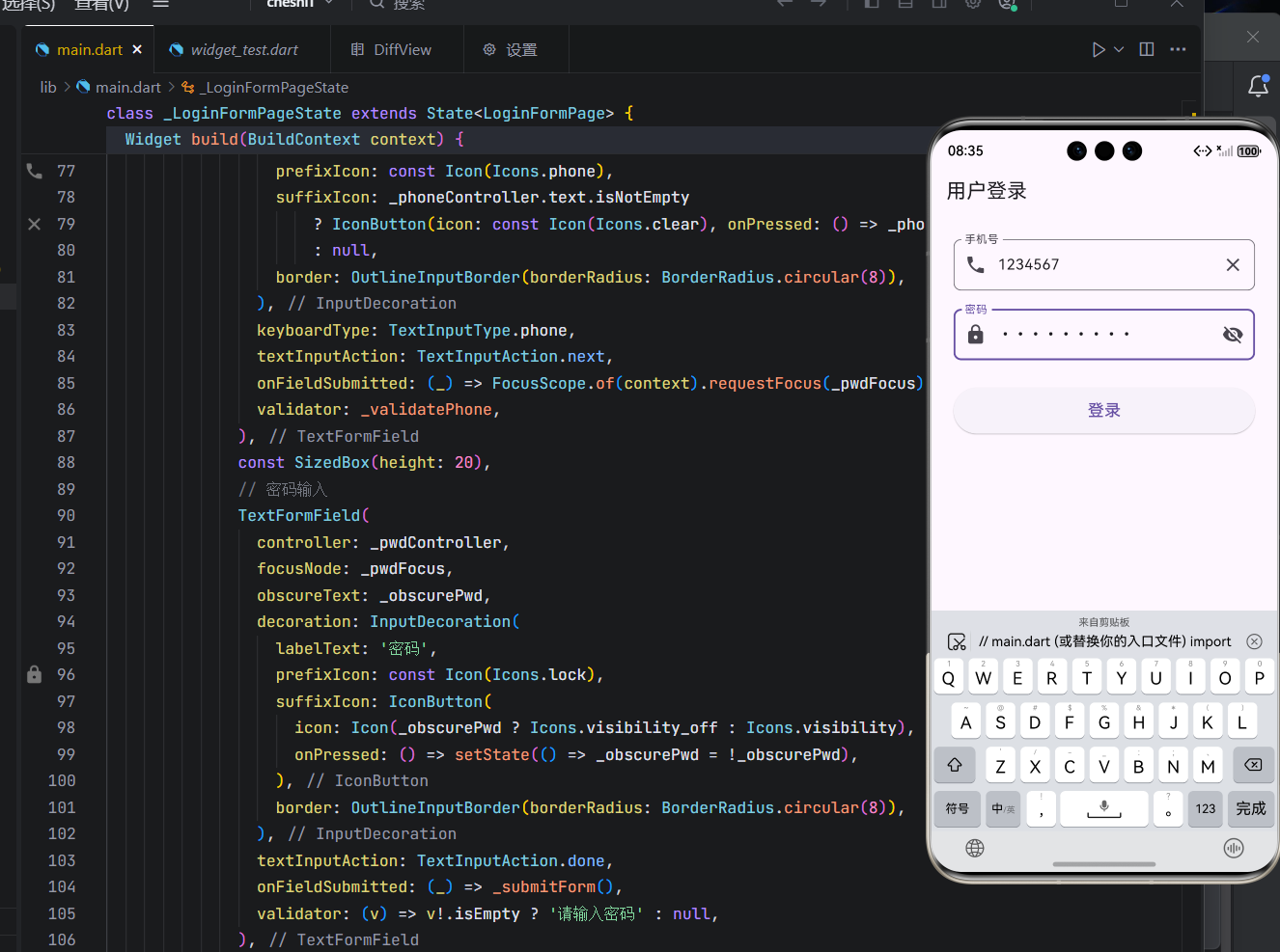 textInputAction: next:点击键盘"下一步"自动跳转到密码框;onFieldSubmitted:配合FocusScope实现焦点转移;suffixIcon:有内容时显示清空按钮。