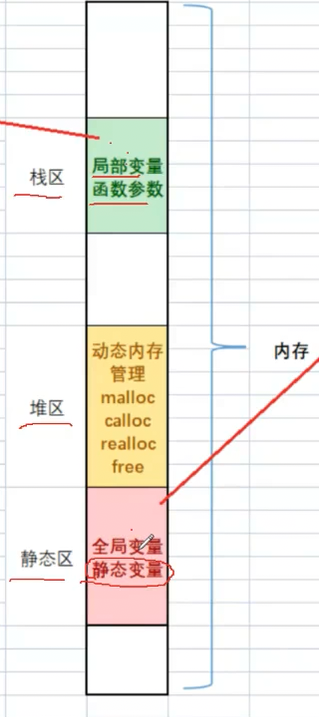 堆区:动态分配的内存(malloc/calloc/realloc申请的空间)
