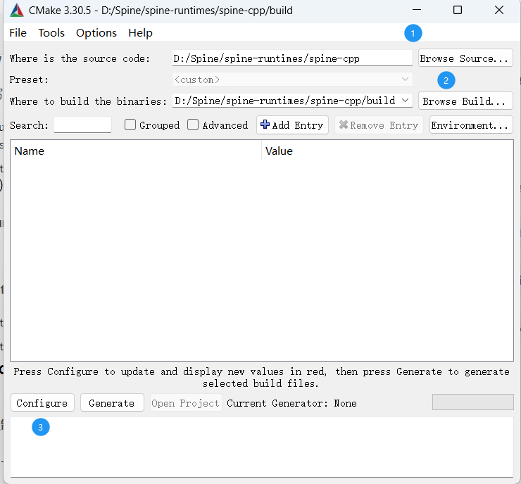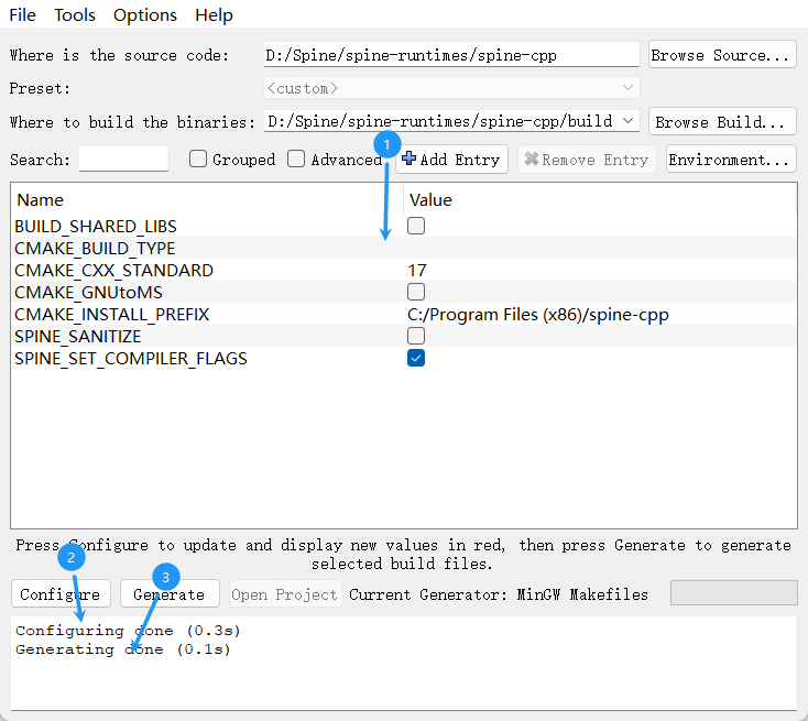 Where is the source code:选择D:\Spine\spine-runtimes\spine-cpp(spine-cpp 源码根目录,有CMakeLists.txt);Where to build the binaries:选择D:\Spine\spine-runtimes\spine-cpp\build(手动新建build空文件夹);