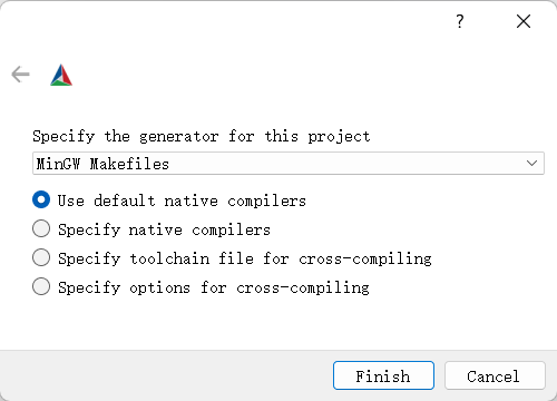 Use default native compilers,点击「Finish」; - 等待底部提示「Configuring done」(黄色警告忽略,红色报错需检查 Qt 的 MinGW 是否安装)。