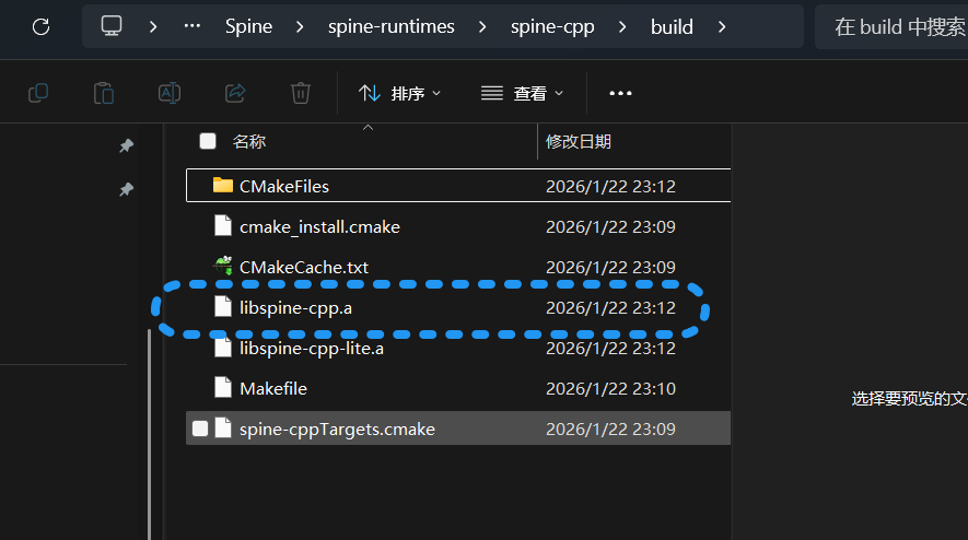 打开D:\Spine\spine-runtimes\spine-cpp\build目录,能看到 libspine-cpp.a 文件(大小约 2-3MB),该文件已整合Spine-C++ 核心 + Qt 渲染支持,为最终需要的静态库。