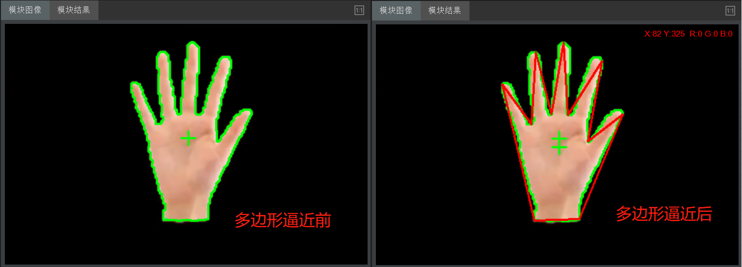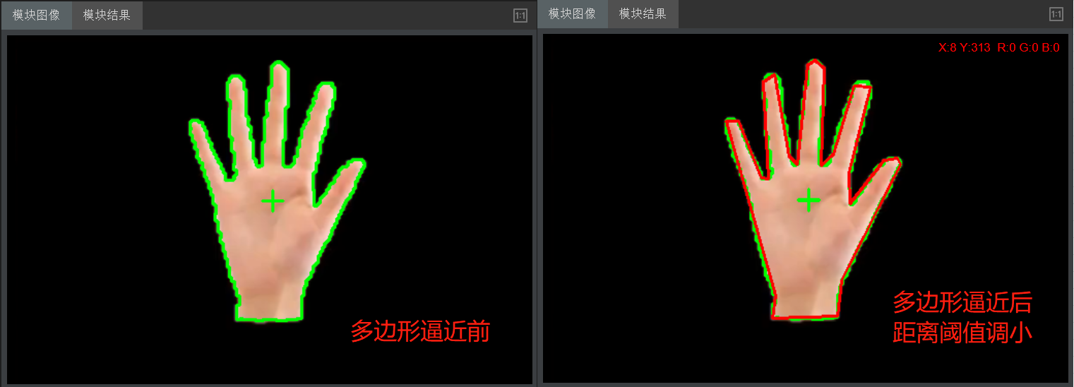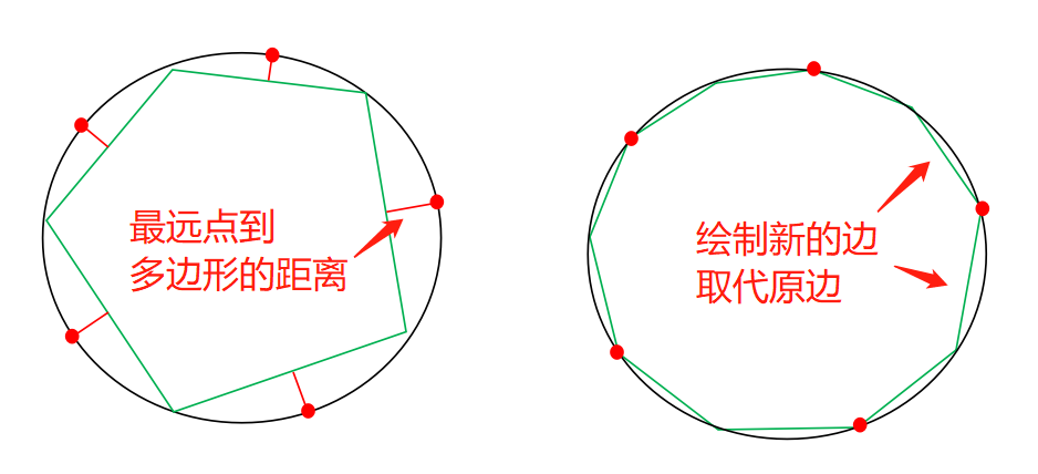 多边形逼近是在获取轮廓的基础上,对轮廓进行相似逼近。通过不断获取距离多边形最远的点,判断点到多边形的距离是否大于指定阈值,是则将此点加入多边形,绘制新的边,取代原边。