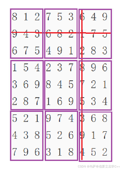 本题题意是在一个9 * 9二维数组中,每一行、每一列、每一个紫色方框都只能有1-9这9个数字,不能有重复的数字。