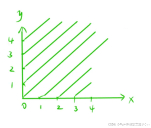 最后是判断主对角线和副对角线,这里我们利用一次函数进行标记,我们知道主对角线的函数为y = x + b, 副对角线函数为y = -x + c,根据一次函数的性质每一个主对角线都有一个唯一的b,每一个副对角线都有一个唯一的c,我们利用两个st数组:st1标记哪些主对角线摆放过和st2标记哪些副对角线摆放过,当填入一个棋子时,我们把棋子的下标(x, y)转化为 y - x,和y + x,将 对应的对应的st数组置为true,但是这里需要注意两个点: