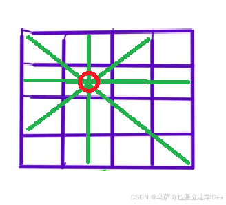 八皇后的原题背景是国际象棋,国际象棋中的皇后棋子的行动范围是一行、一列、主对角线和副对角线,如下图所示,本题题意就是在棋盘上摆放皇后旗,让任意两个皇后棋不会互相打起来。