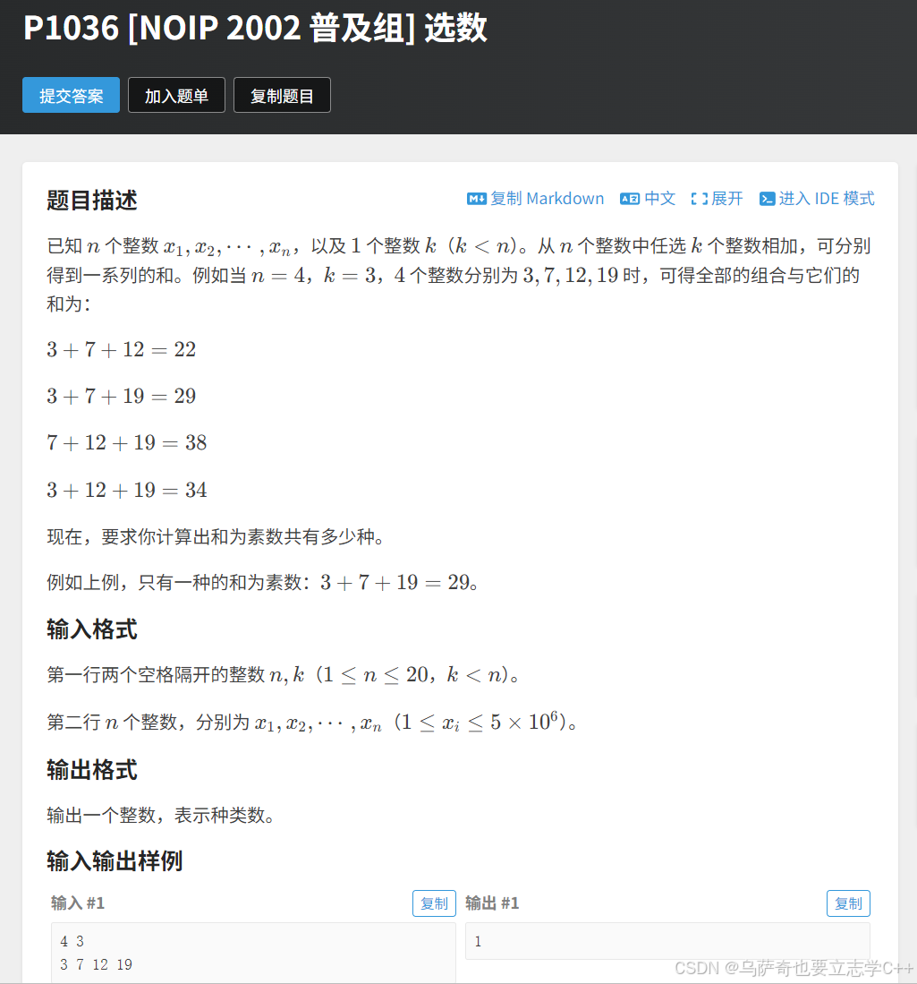 本题的搜索思路和上一章介绍的组合型枚举基本相同,无非就是多了一个判断是否是素数,我们采用试除法,将目标数字num分别与2-根号下num相除,如果所有数都除不尽则为素数。