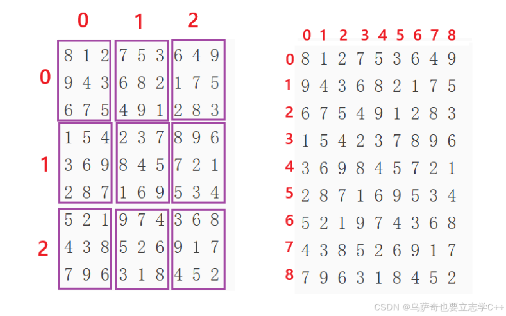 注意:1、本题的粗线宫一共有9个,3 * 3,我们在进行标记时需要找到当前格子对应哪个粗线宫,所以需要将数独棋盘的行、列下标设置为0-8,这样不管是行下标还是列下标,只有除以3就就可以得到粗线宫的下标0-2。