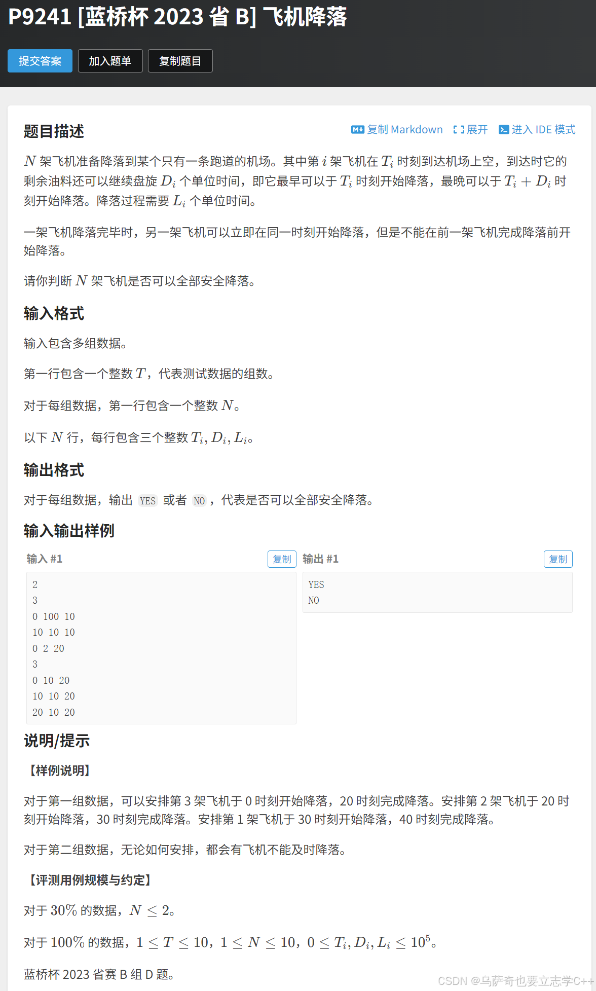 2、本题的dfs除了需要传递pos位置,还需要传递上一架飞机的降落结束时间,因为当前飞机需要判断比较飞机最晚起降时间(t[i] + d[i] )和上一架飞机的降落结束时间(end),如果飞机最晚起降时间小于上一架飞机的降落结束,说明当前飞机的油量不足以支撑到上一架飞机的降落结束,需要将该分支剪掉,也就是continue。