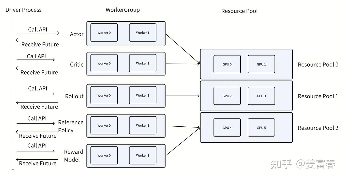 VERL 具体实现中,RayPPOTrainer类扮演着Driver Process的角色, 它负责初始化并构建Worker 和 WorkerGroup ,同时运行 PPO 算法的主循环,RayPPOTrainer 的 fit 函数是以单进程形式运行。WorkerGroup将在其指定的资源池(Resource Pool)上构建。资源池可以理解是 Ray 集群中的一组 GPU。