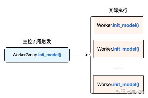 ## WorkerGroup执行 init_model()初始化,实际是触发了所有绑定Worker执行init_model()执行,如下图所示