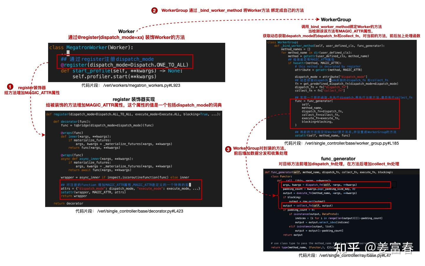 - WorkerGroup通过_bind_worker_method方法将Worker的所有方法绑定成自己的方法,当识别一个目标方法有MAGIC_ATTR属性,拿到"dispatch_mode"配置动态实例出dispatch 和 collect方法,并调用func_generator返回一个新的方法绑定给WorkerGroup,新方法的执行逻辑: dispatch -> 目标方法 -> collect,实现数据自动分发和收集