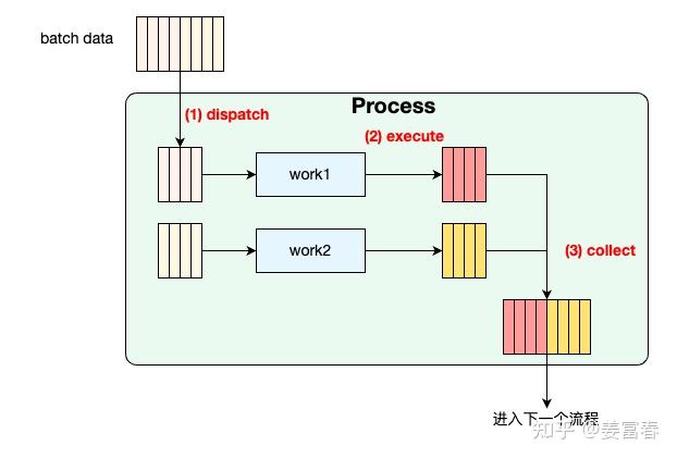 由于是多Worker运行,会涉及到对数据的分片和拼接处理,从图中的每个Process(绿色的块)都是一个WorkerGroup的方法,我们展开一个绿色的Process块看下细节,大概是这样(如下图所示):