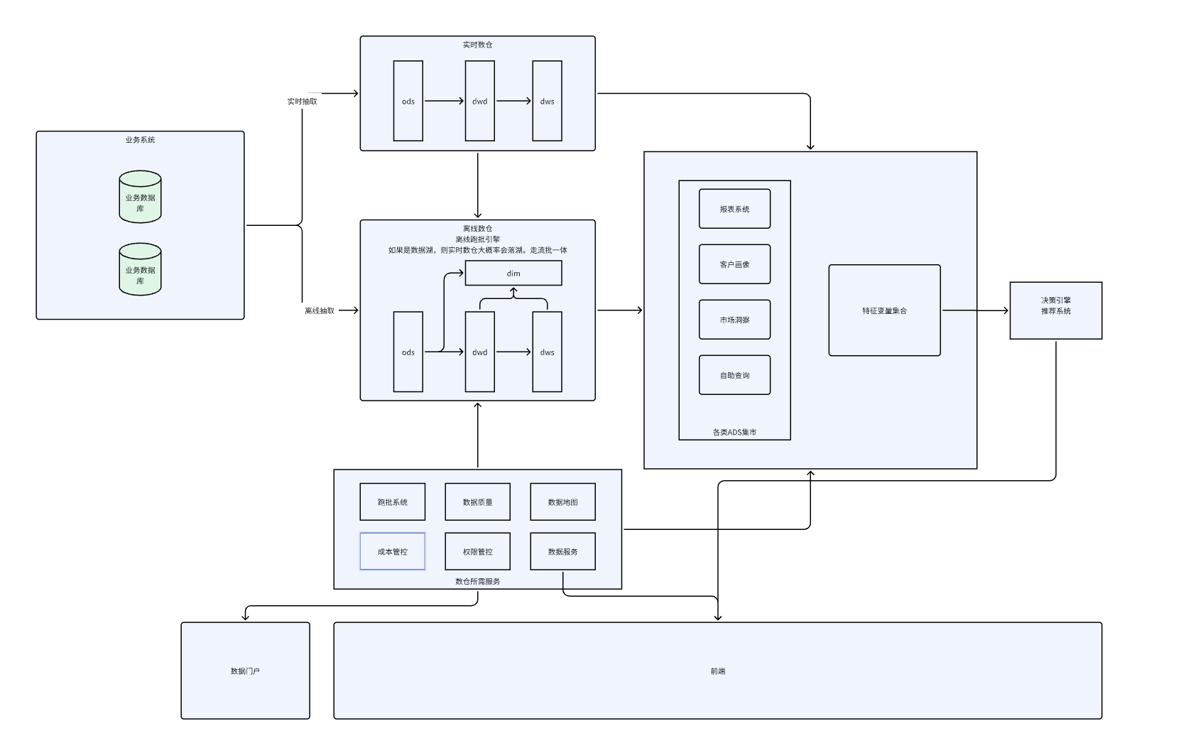 这个架构前端通过数据服务或者直接访问ads层数据进行展示。ads层的各个业务模块可以抽象成不同得数据产品供前端使用。从这个角度看,这个架构就是数据中台架构。但是实际情况不要过度教条,数仓或者ads能解决的是共性的问题。