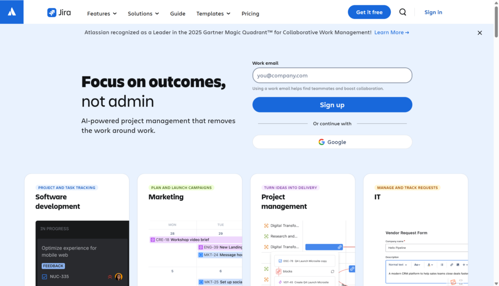 核心功能: Backlog 管理、Sprint 规划、看板流动、燃尽与速度报表、可配置工作流、字段与权限体系,以及丰富的扩展插件。和 Confluence 结合时,文档沉淀与知识协作会更顺。