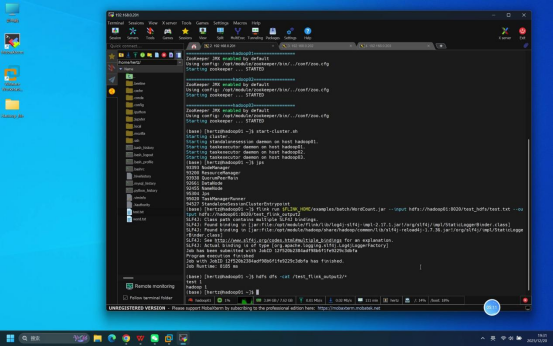 操作说明:在hadoop01节点终端中,执行与完全分布式测试文档一致的Flink批处理任务测试命令,验证Flink核心计算功能。