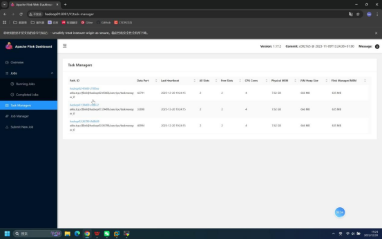 操作说明:在本地打开浏览器,访问Flink JobManager节点的Web管理页面,查看"Task Managers"栏目验证节点状态。