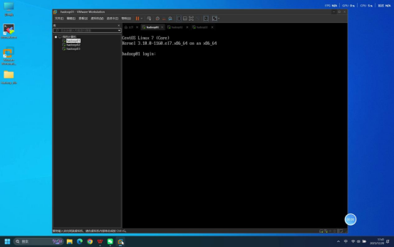操作说明:分别检查3台虚拟机(hadoop01、hadoop02、hadoop03)的启动状态,确保每台虚拟机系统加载完成,均已到达登录页面。