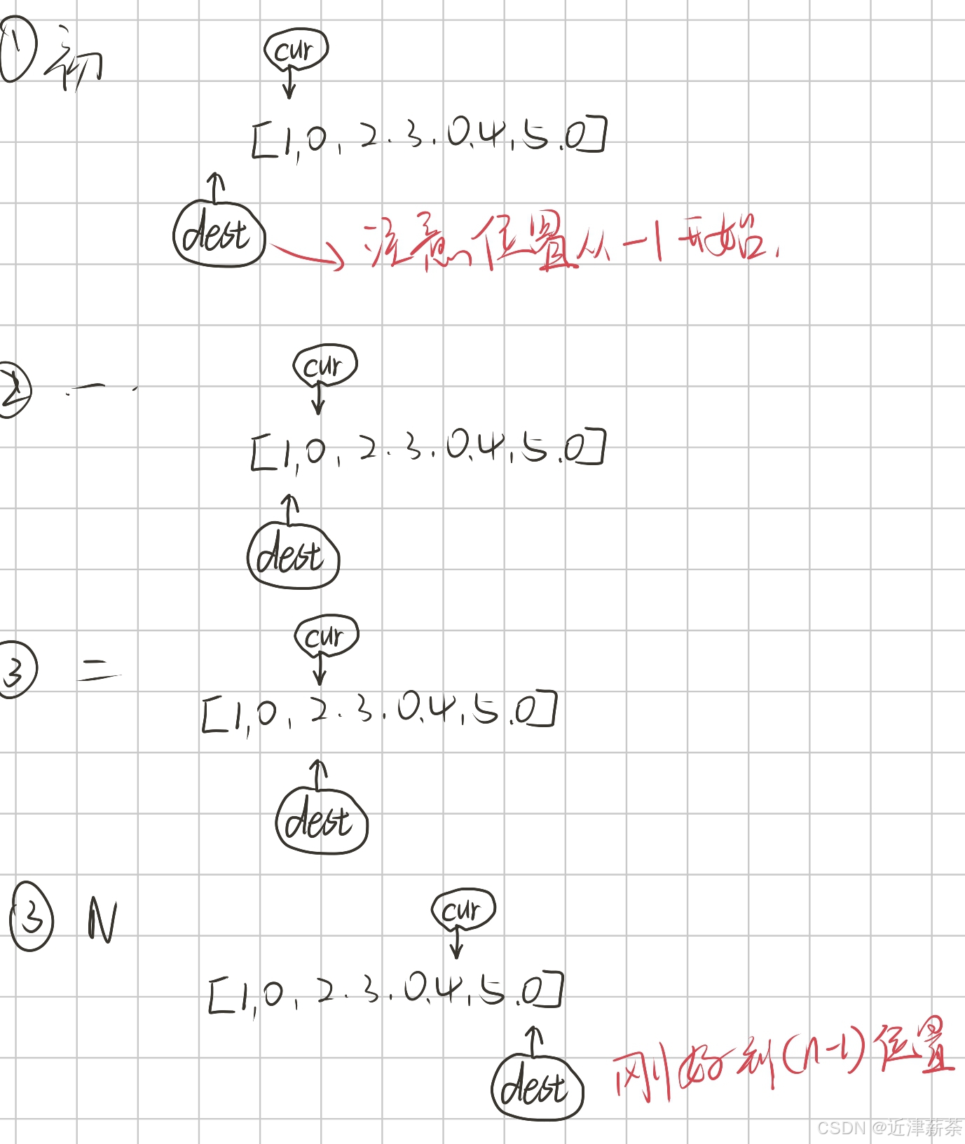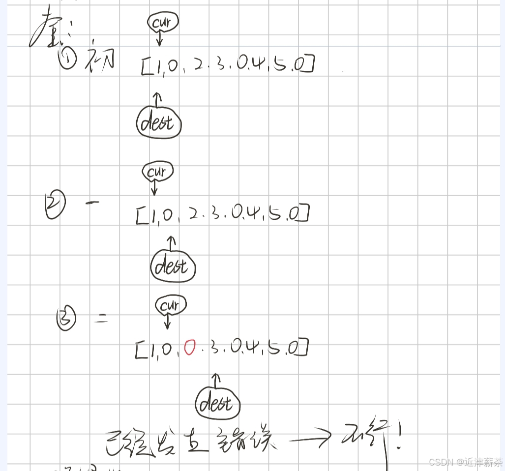 首先,在数组长度固定的情况下,dest的写入是一定不会超过cur的,因为我们在遍历之前已经确定好了起始位置,即从最后一个被复写的元素开始向前遍历。cur和dest的运动逻辑是已经被确定好了的,命中注定了的~