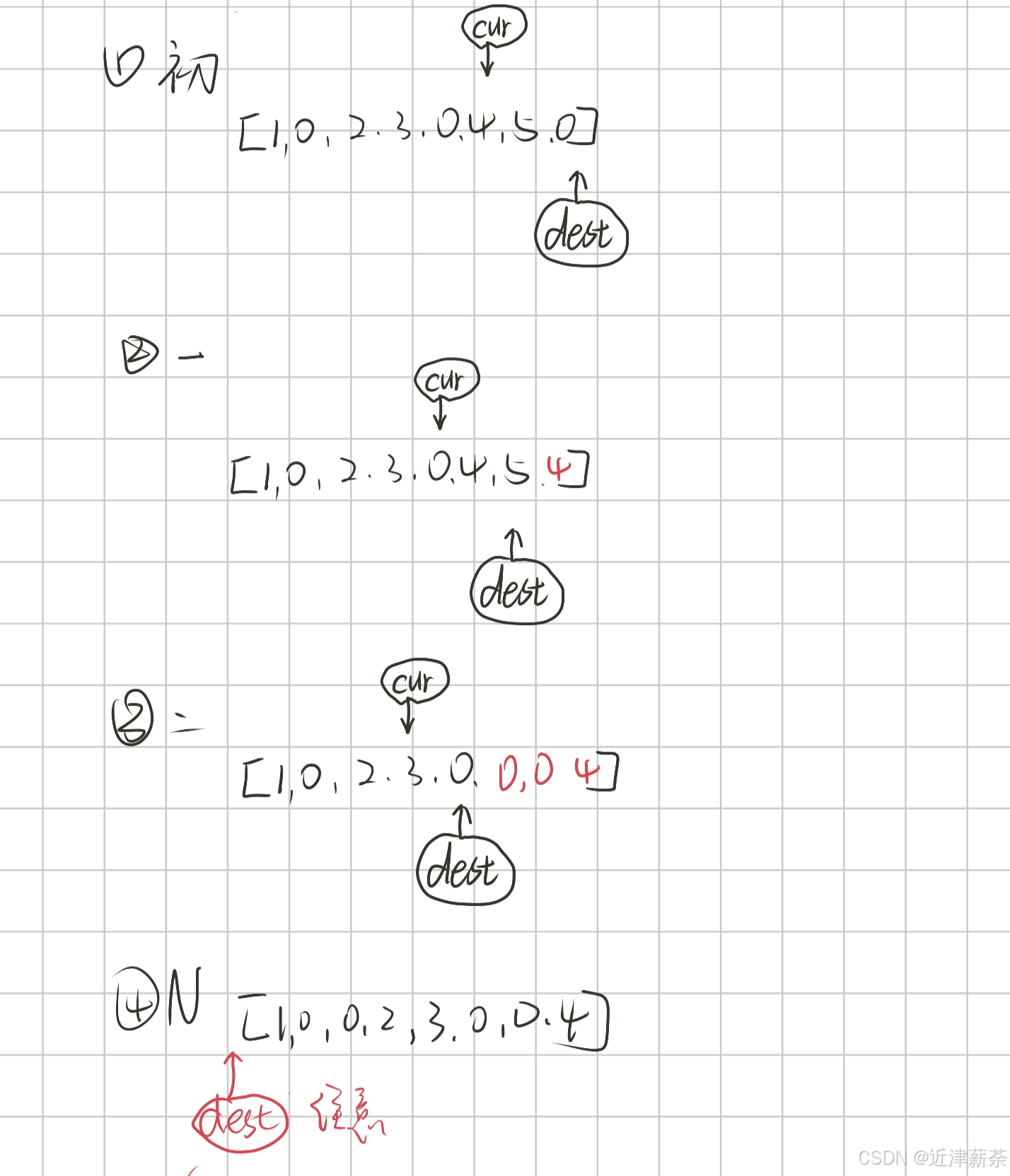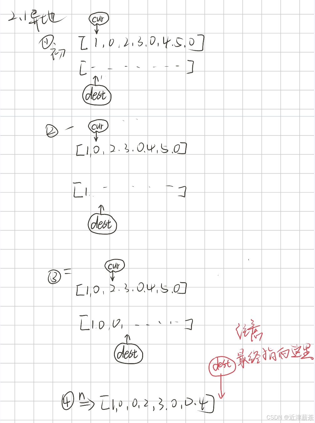 1:从后往前遍历的过程中,dest的复写位置不会超过前边的cur吗,然后和从前往后一样,元素被覆盖。