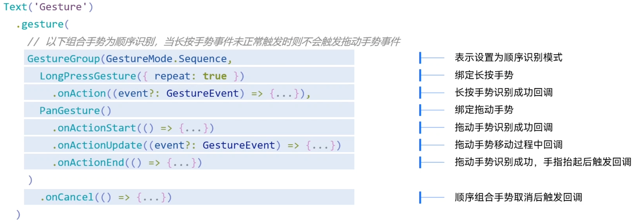 mode:为GestureMode枚举类。用于声明该组合手势的类型。顺序识别组合手势对应的GestureMode为Sequence,并行识别组合手势对应的GestureMode为Parallel,互斥识别组合手势对应的GestureMode为Exclusive。