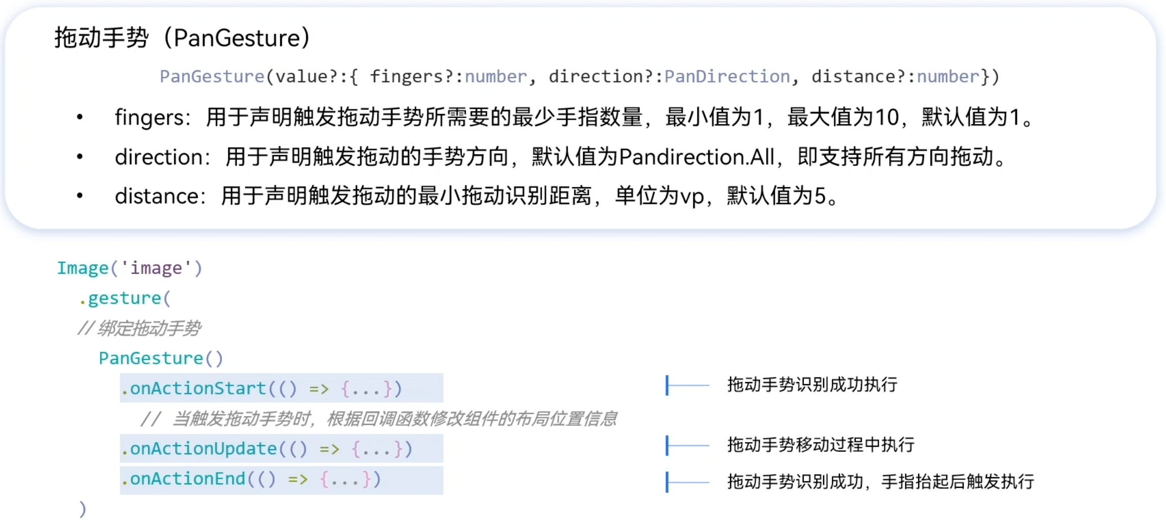 拖动手势中,distance用于声明触发拖动的最小拖动识别距离,默认5vp;